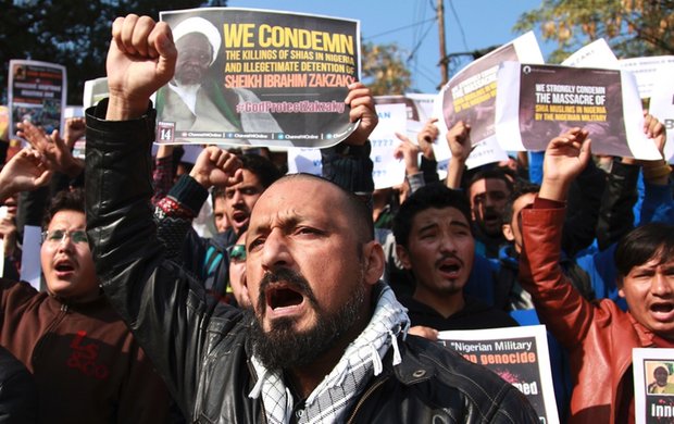 Muslims students carry placards and shout slogans against the Nigerian government against the killings of hundreds of Shiite Muslims and detaining their leader Ibraheem Zakzaky in Nigeria, in Jammu, India, Tuesday, Dec. 1 5, 2015. Nigerian Soldiers killed hundreds of Shiite Muslims this weekend after their group opened fire on the convoy of Nigeria's army chief, the Shia Islamic Movement and military reports said Monday.